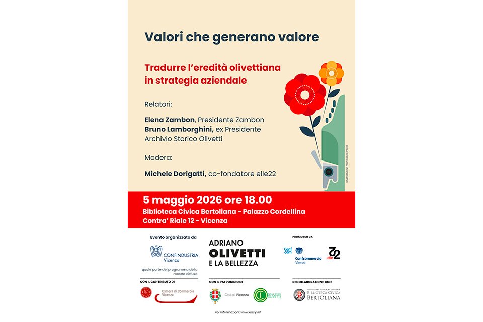 L’incontro è organizzato da Confindustria Vicenza nell’ambito del programma della mostra diffusa "Adriano Olivetti e la Bellezza". L’iniziativa è promossa con elle22 e Confcommercio Vicenza, con il contributo della Camera di Commercio di Vicenza, il patrocinio della Città di Vicenza e di Spille d’Oro Olivetti ETS, in collaborazione con la Biblioteca Civica Bertoliana.