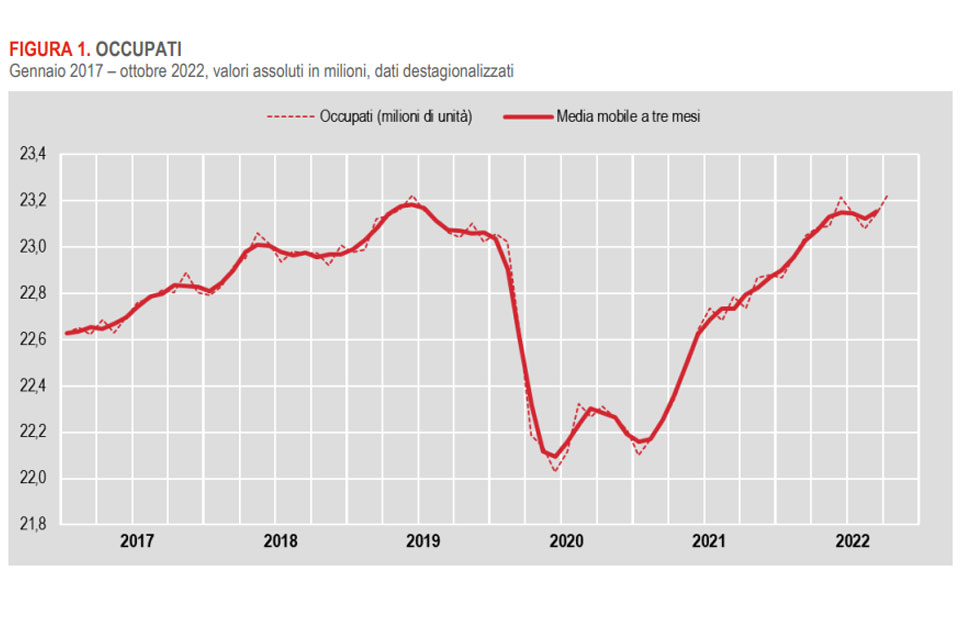 Il numero di occupati a ottobre 2022 supera quello di ottobre 2021 del 2,2% (+496mila unità).