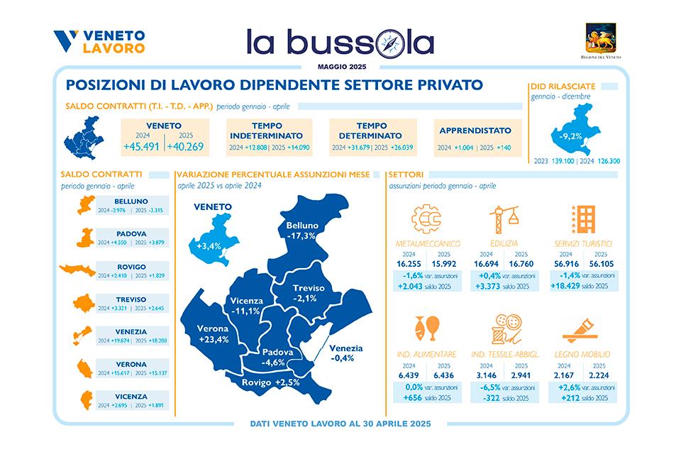 Nei primi quattro mesi del 2025 il bilancio del mercato del lavoro in Veneto risulta positivo per +40.300 posti di lavoro dipendente, un risultato inferiore rispetto a quello dello scorso anno (+45.500) nonostante il buon andamento del mese di aprile (+19.300), che ha beneficiato del posticipo dell’avvio della stagione turistica rispetto allo scorso anno. Sono questi i principali dati diffusi da Veneto Lavoro ne "La Bussola" riferita ad aprile 2025. Nell’ultimo mese, infatti, le assunzioni sono cresciute del +20% nel settore dei servizi turistici e del +3% complessivamente, con un aumento particolarmente significativo per i contratti a tempo determinato (+16.000 posizioni lavorative nell’arco del mese e +7% delle attivazioni contrattuali) dovuto proprio alla stagionalità che caratterizza il periodo.