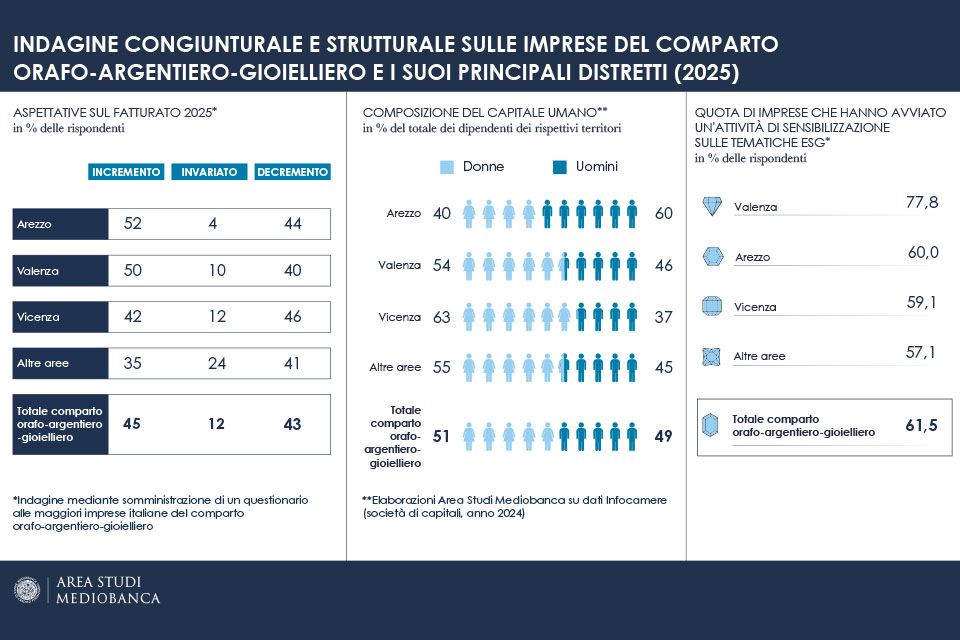 Il 2024 si è chiuso con un fatturato in crescita del +5% rispetto all’anno precedente. Spiccano i risultati dei distretti di Arezzo e Vicenza (+8%), mentre Valenza ha registrato una contrazione del -3%. Guardando al 2025, il quadro è incerto: il 45% delle aziende prevede un aumento dei ricavi, il 43% teme un calo e il 12% indica stabilità. A livello territoriale, emerge maggiore fiducia ad Arezzo (52%) e Valenza (50%), mentre Vicenza mostra un equilibrio tra ottimisti (42%) e pessimisti (46%).