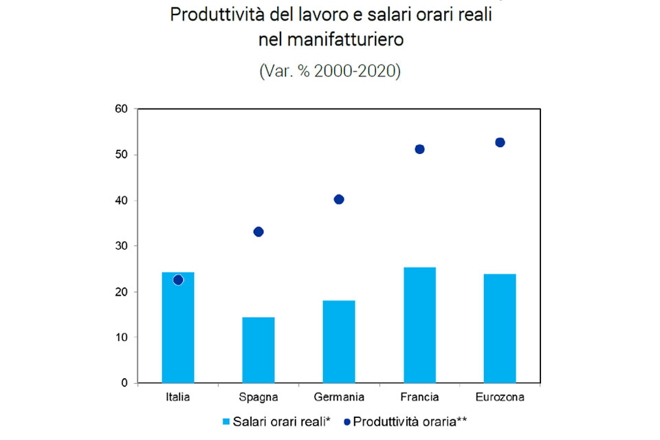 La crescita dei salari reali nel settore manifatturiero italiano tra il 2000 e il 2020 è stata pressoché in linea con quella registrata in Francia (+25,3%) e superiore a quella della Germania (+18,1%) e della Spagna (14,4%). In tutti i principali paesi competitor, tuttavia, la produttività del lavoro è cresciuta ben più che in Italia, due volte tanto in Germania (+40,2%).