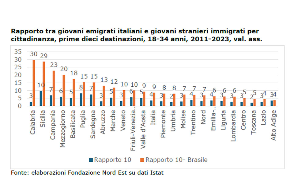 Nel 2011-23 i primi dieci Paesi di destinazione dei giovani italiani sono, in ordine di grandezza delle partenze: Regno Unito, Germania, Svizzera, Francia, Spagna, Brasile, Stati Uniti d'America, Paesi Bassi, Belgio e Australia. In tali Paesi sono emigrati 205mila giovani italiani dal Nord Italia, che ha visto arrivare 67mila giovani cittadini di quelle stesse nazioni, 28mila senza il Brasile.