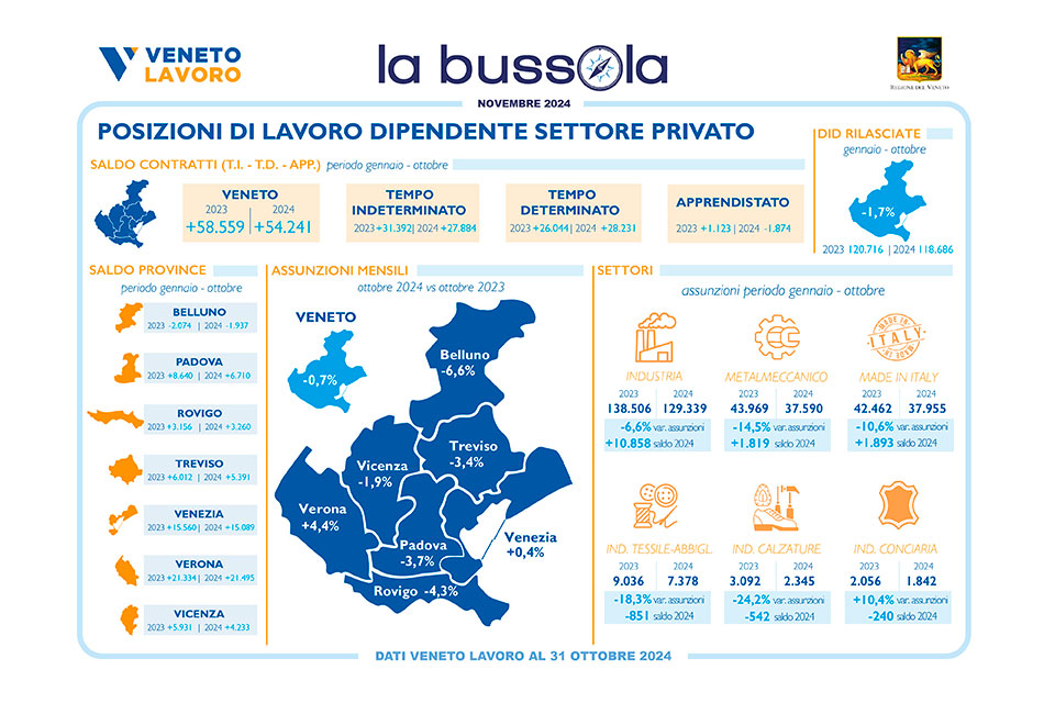 Nei primi dieci mesi del 2024 il bilancio del mercato del lavoro dipendente privato in Veneto è positivo per +54.200 posizioni di lavoro, è quanto rileva Veneto Lavoro nell'edizione di ottobre 2024 de La Bussola. Tale saldo rimane al di sotto dei livelli registrati nell’analogo periodo dell’anno precedente ma si mantiene al di sopra dei risultati del 2019 e 2022. Il rallentamento rispetto allo scorso anno è dovuto ad una modesta contrazione delle assunzioni nel periodo (-1%) a fronte di una stabilità nelle cessazioni. L’ultimo mese registra un leggero calo delle attivazioni (-1%) che, insieme al lieve aumento delle cessazioni (+1%), contribuisce al contenuto ridimensionamento del saldo mensile (-18.700) rispetto al 2023 (-18.000).