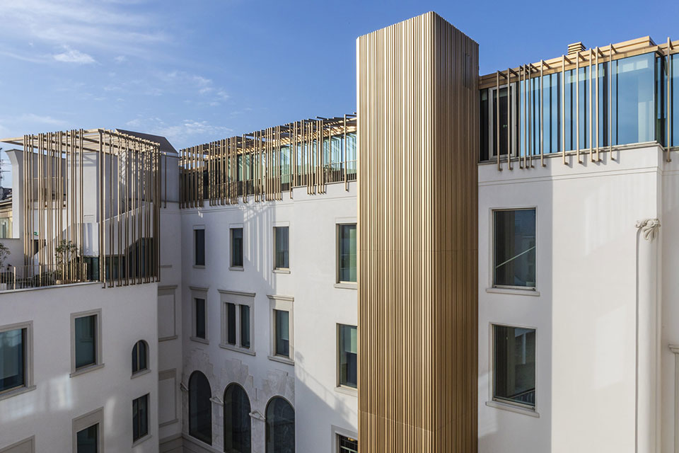 Il progetto ha coinvolto l’intero edificio: quattro piani fuori terra e quello interrato, una nuova copertura per rendere agibile anche l’ultimo piano, l’innesto di un’area a verde nel cortile interno, e la creazione di una hall dalle generose dimensioni. Un attento intervento di restauro è stato effettuato sulla facciata di via Caradosso e sulle porzioni originali. Il fronte verso la corte è stato invece aggiornato e le facciate ridefinite con una superfetazione in quota copertura e addizioni per gli elementi di collegamento verticale, creando così un ponte progettuale tra gli anni Venti del Novecento e gli anni Venti del Duemila, senza soluzione di continuità.