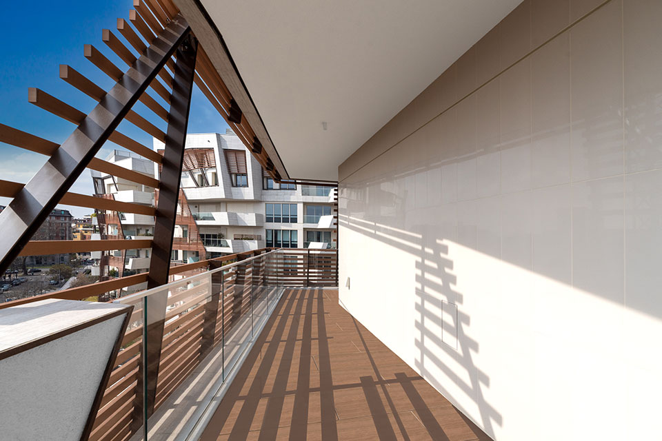 Il secondo lotto delle Residenze Libeskind si ispira al modello a corte reinterpretato per creare edifici a schema aperto, cioè in relazione tra loro e col contesto esistente. I volumi semplici ad arco di cerchio, che si alternano a volumi sfaccettati, apportano un effetto scultoreo che rende ciascun edificio unico e irripetibile. Composto da 3 edifici di altezze che variano dai 6 ai 10 piani, il complesso prevede 101 appartamenti, tutti dotati di terrazze che offrono affacci e luminosità particolari a ogni singola unità abitativa grazie ai parapetti tutto vetro installati da Gonzato Group.