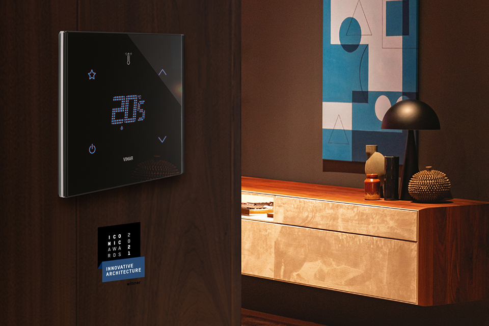 Il termostato Touch Eikon Tactil, realizzato in cristallo nelle finiture bianco e nero diamante, è dotato di sensore di prossimità che accende il display RGB a matrice di led non appena ci si avvicina al dispositivo. L’innovativa funzione 3D gesture ne permette inoltre il controllo con dei semplici gesti, senza toccarlo. Disponibile con tecnologia By-me Plus e KNX si integra perfettamente nei sistemi Vimar di home & building automation conferendo agli ambienti, sia del residenziale che degli hotel, un tocco esclusivo che arricchisce il comfort abitativo.